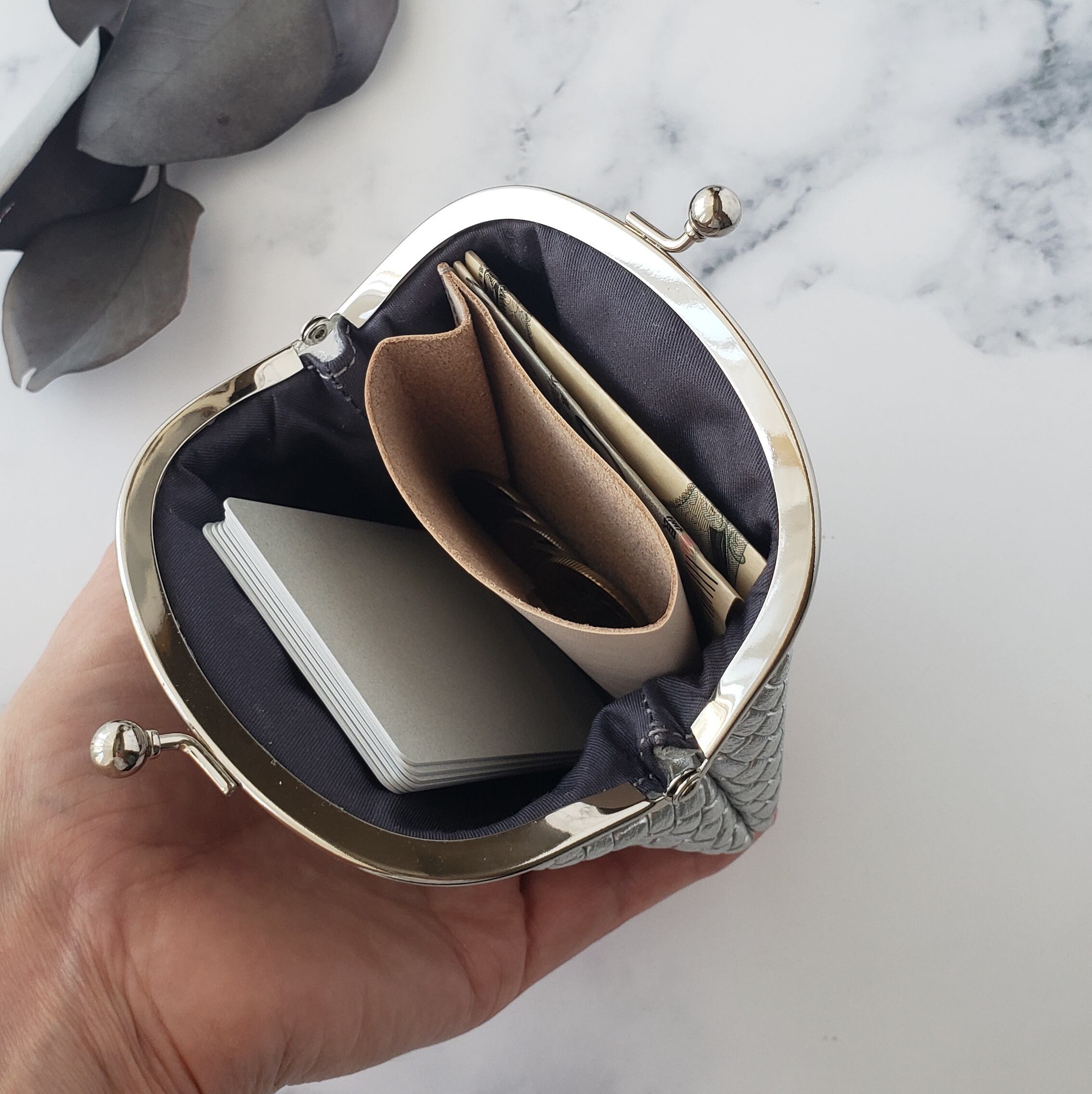 思い返すと、私自身も以前はがま口財布を愛用していました。コンパクトなのにワンアクションで開け閉めができ、中身が見やすい。現金を持ち歩く量が少ない今の暮らしにこそ、ぴったりだと感じます。そこで、余計な装飾を省いたシンプルながま口をお作りしました。