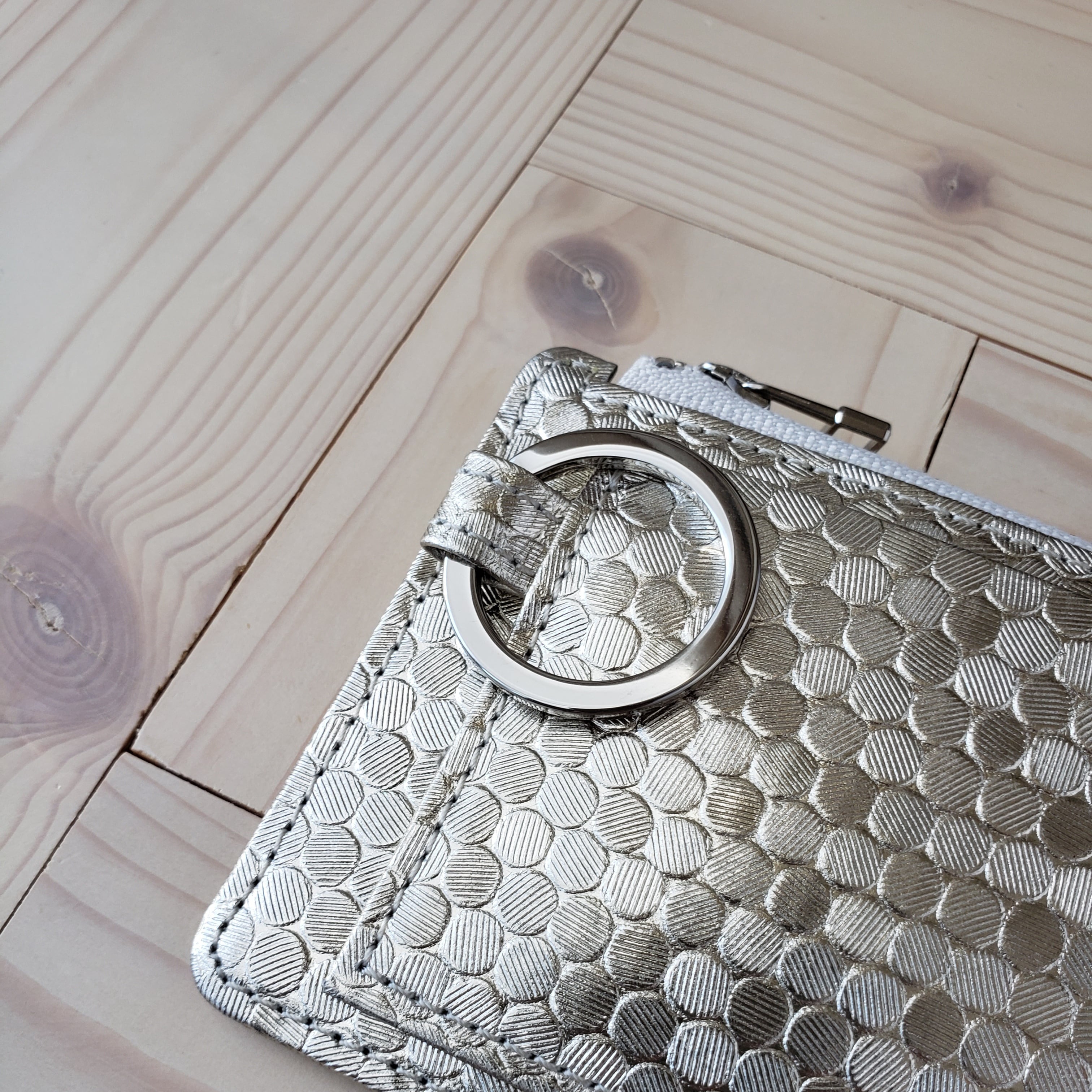 表に付けたリングは鍵の取りつけもでき、また、ナスカンやチェーンなどを通してお使いいただけるようにしました。