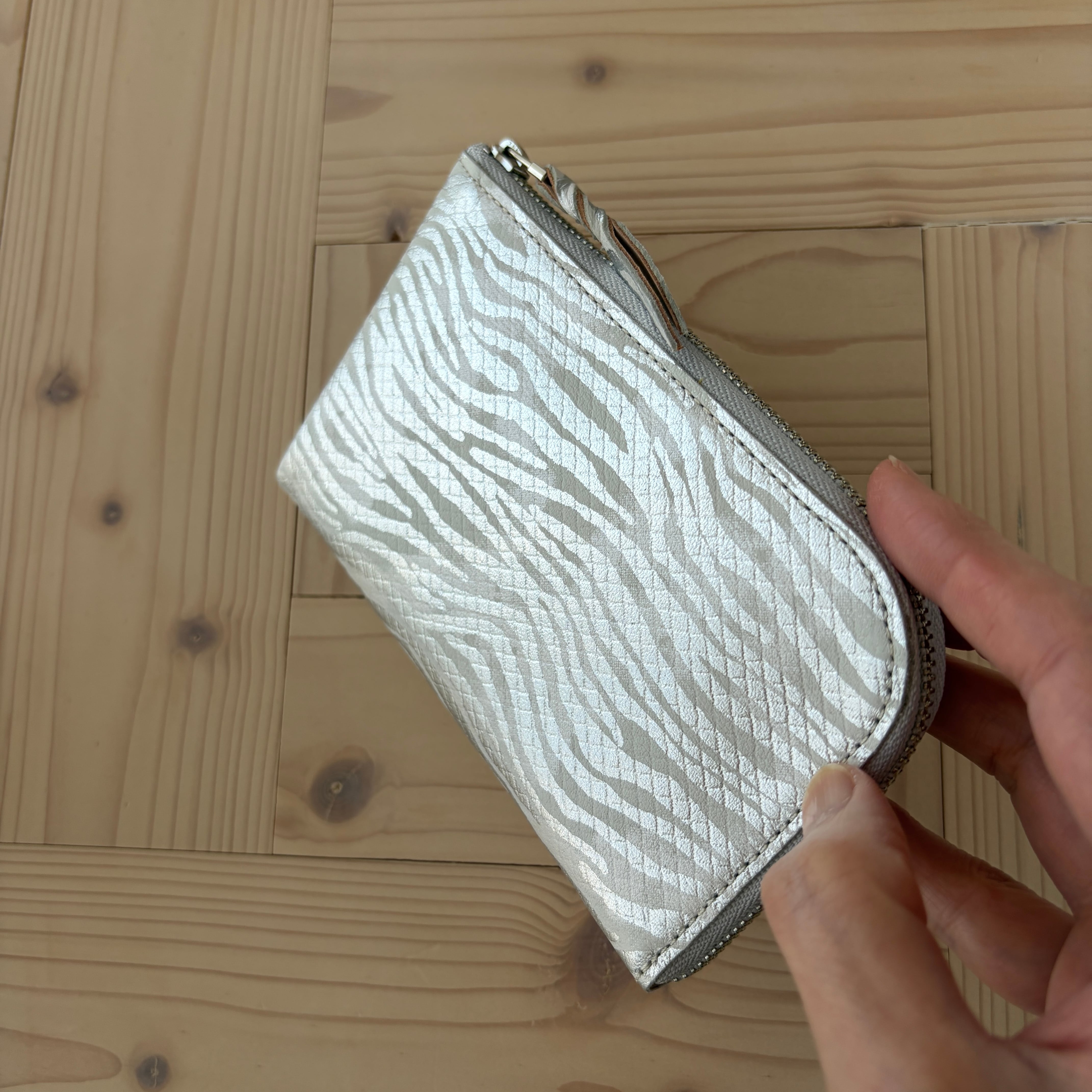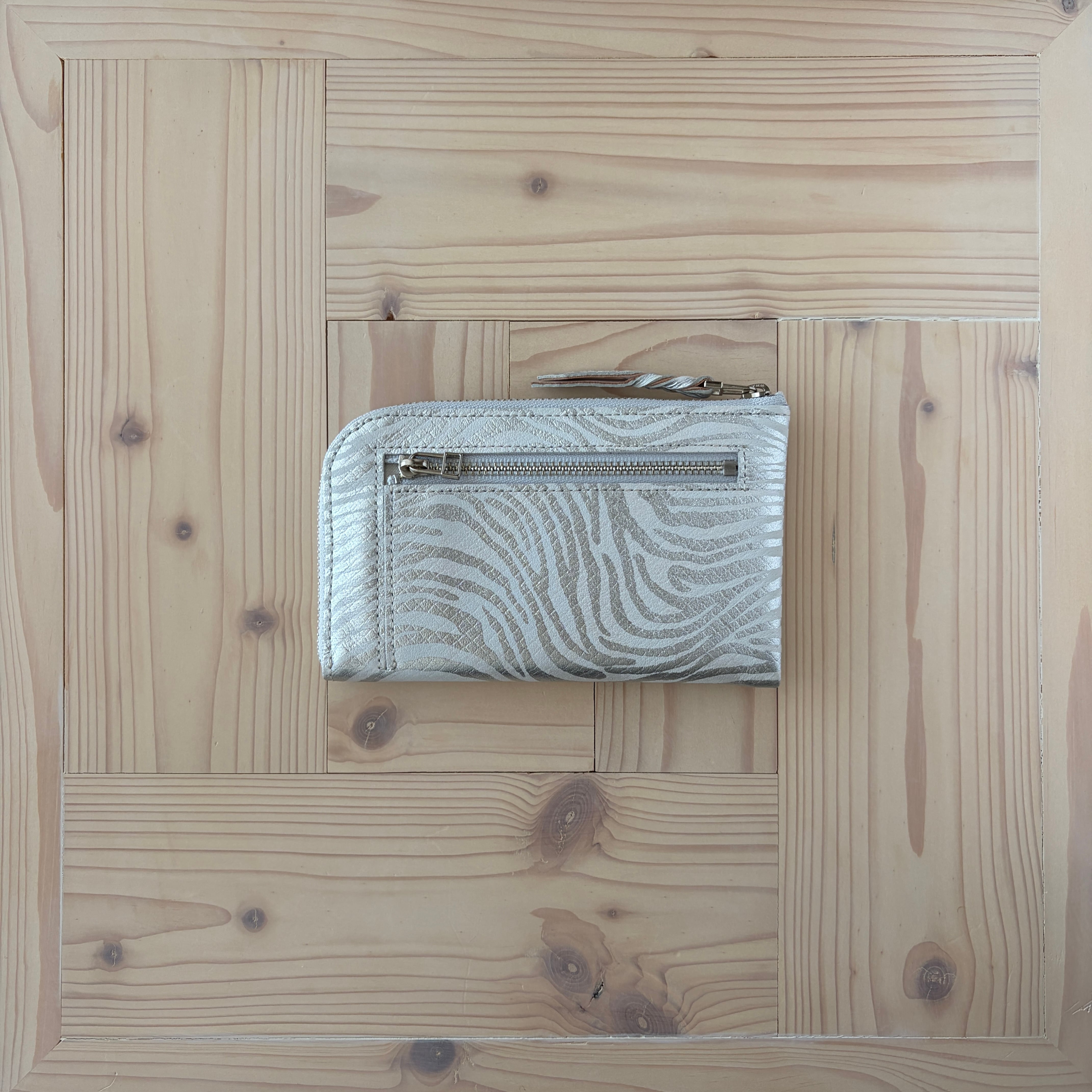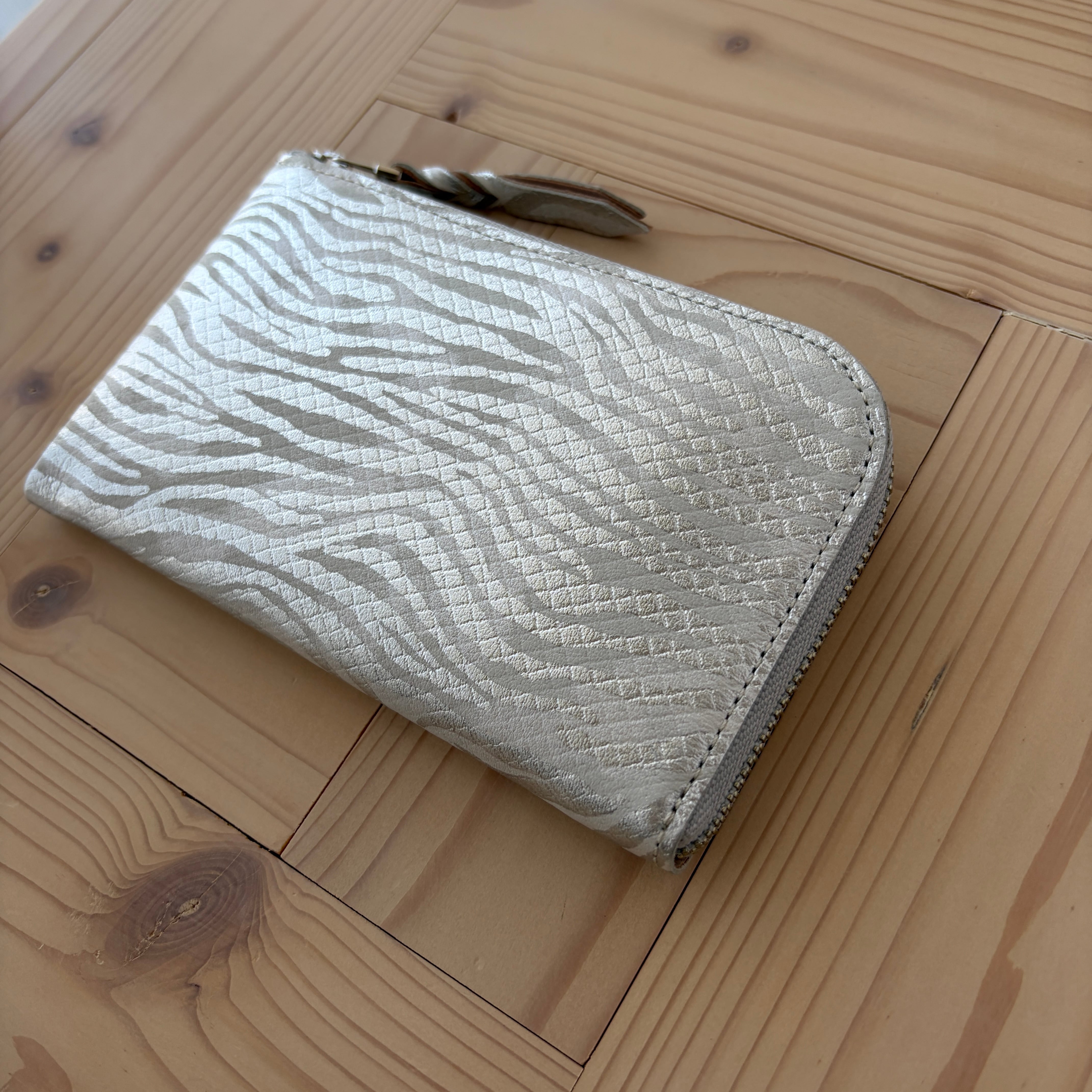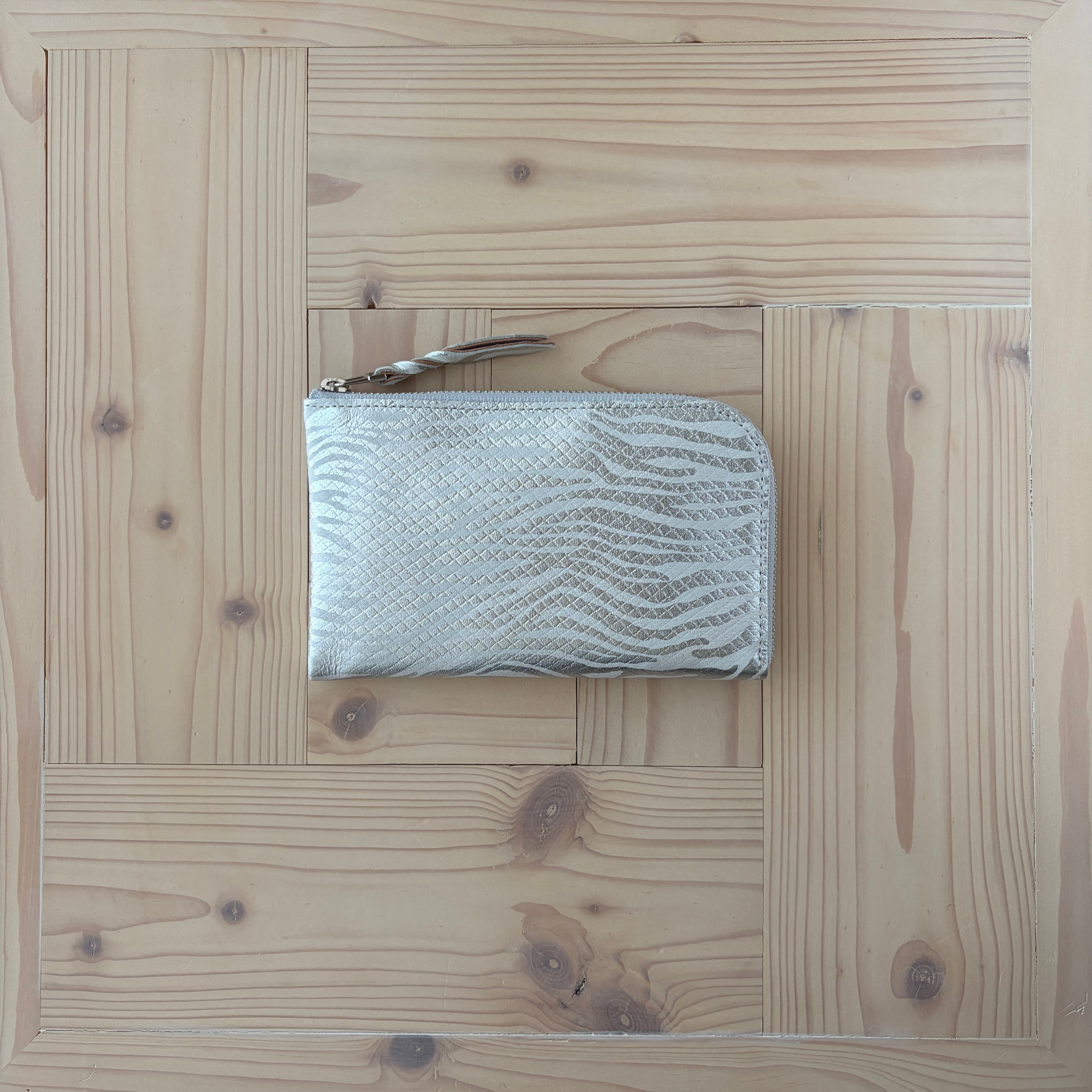 ベースに施したシルクプリントの優しい染色が、角度と光の加減により、ふんわりと浮き出てウェーブ状の箔とスクエアの型押しの表現に深みを与えてくれています。